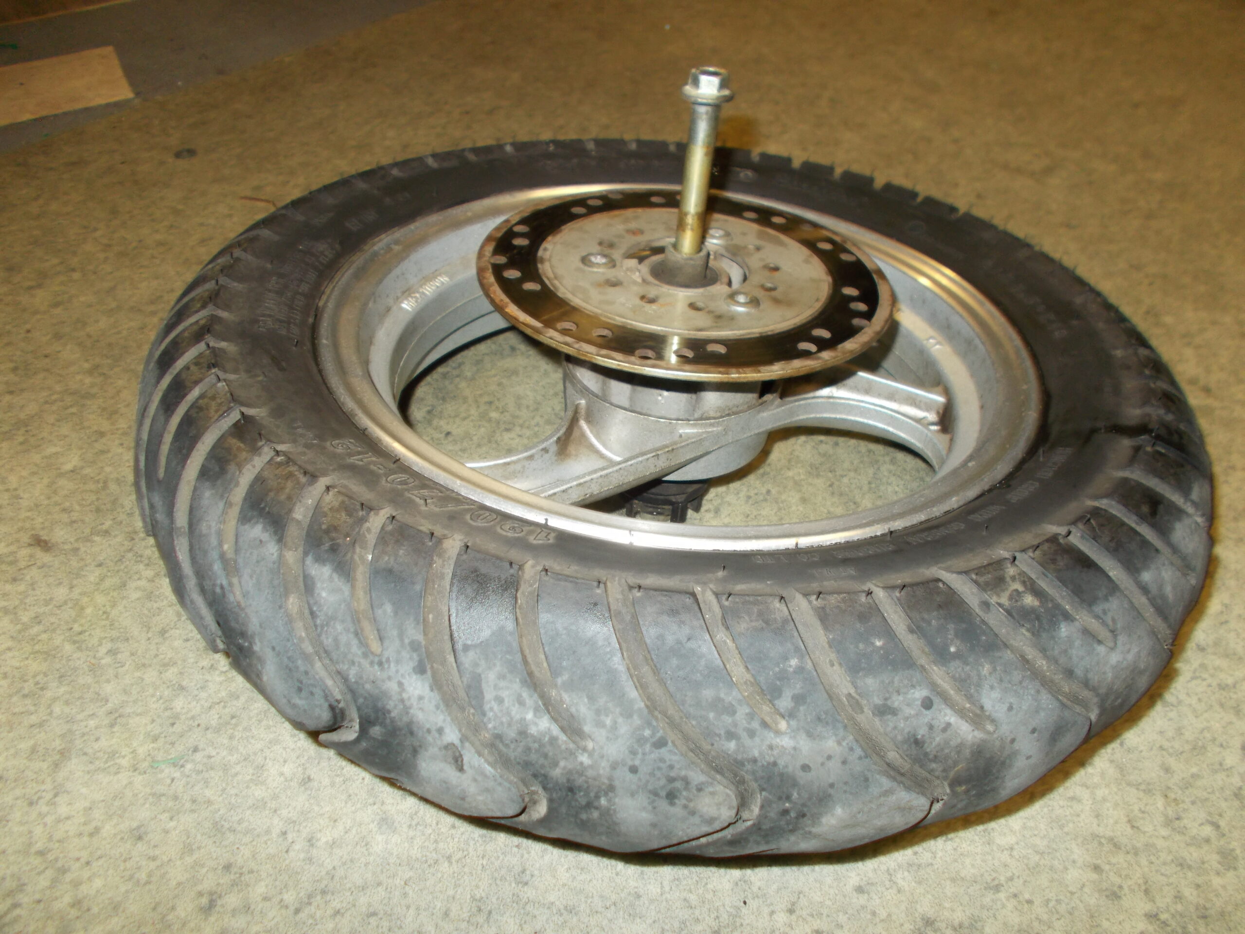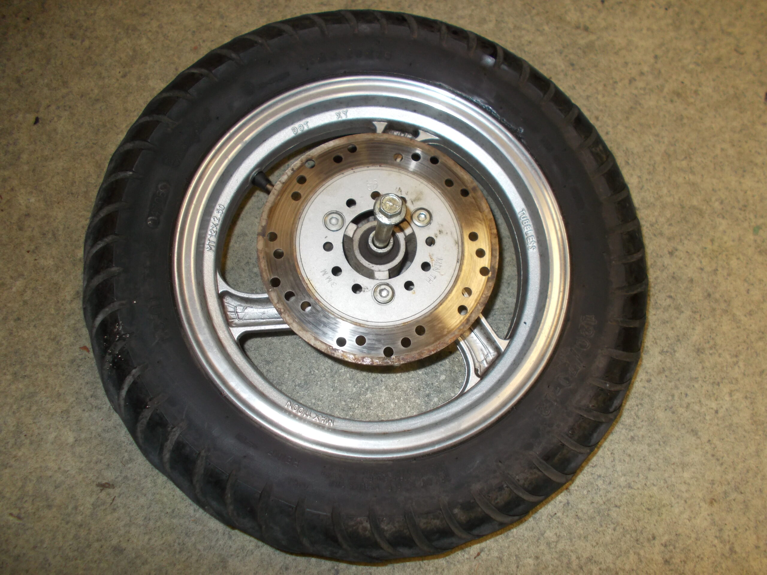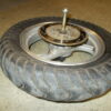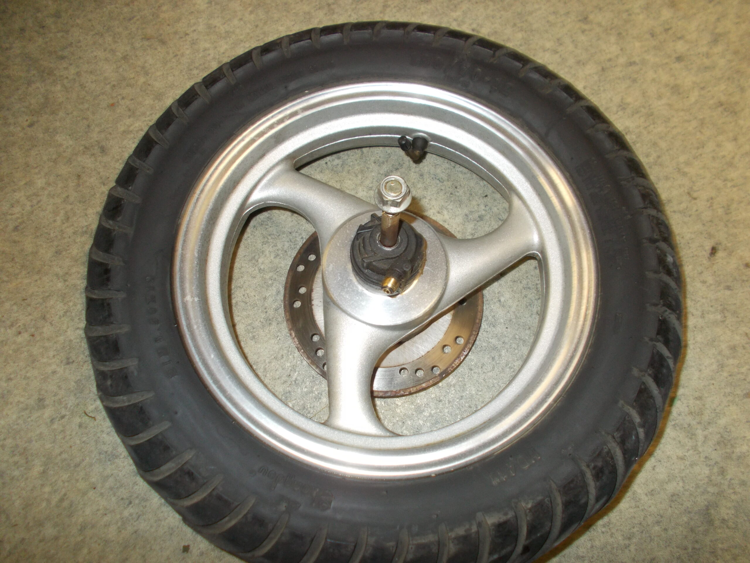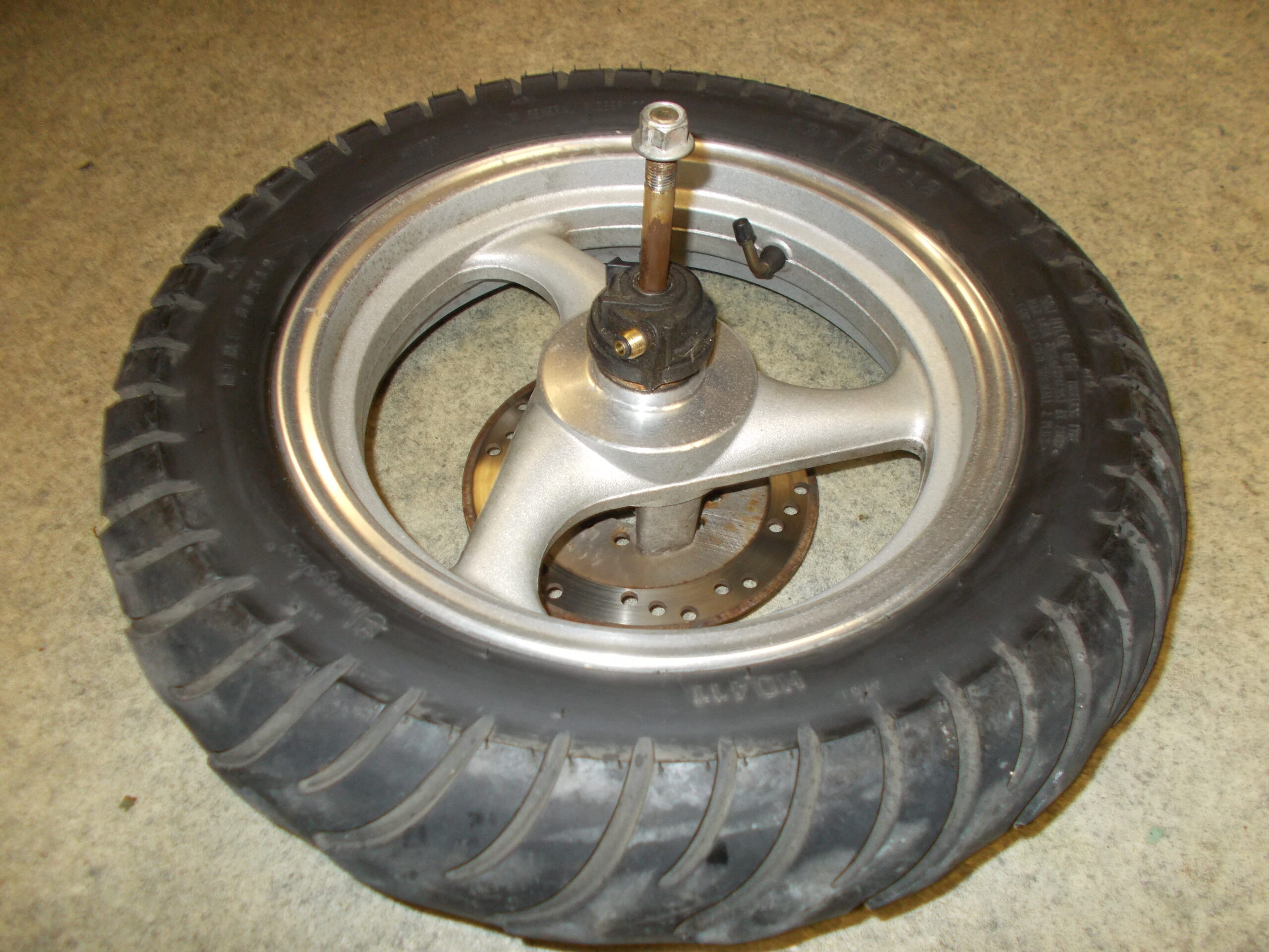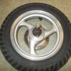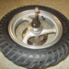 Gebrauchte vordere Felge incl. Bereifung, Bremsscheibe, Steckachse und Tachoantrieb von einem Motorroller