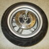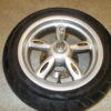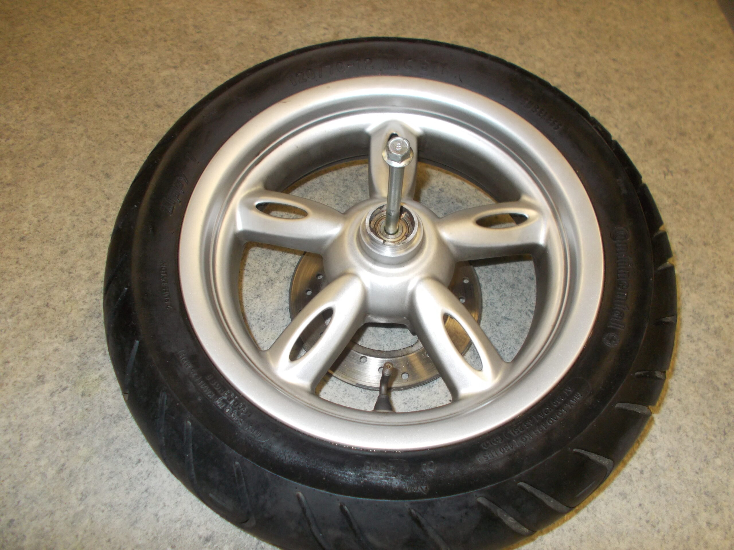 Gebrauchte vordere Felge incl. Reifen, Bremsscheibe, Distanzbuchse und Steckachse von einem Motorroller Yamaha Neos 50ccm baugleich mit MBK Ovetto 50ccm. Baujahr 2009
